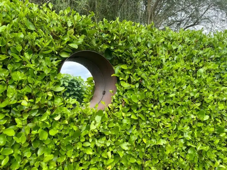 You’ll get panicles of tiny apple-green flowers in spring, which you may not even notice. Small purple-black berries follow on female plants if there are males close by. And this is an animal-friendly hedge so you can use it near horses and farm animals. Birds can drop the seeds and seedlings can and do occur, although clipping tends to deter flowering. Griselinia will grow up to a foot to eighteen inches (30 – 45 cm) every year, when happy.
