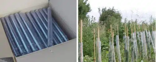 Included in the Sundries to minimise damage from animals that love the tender new shoots and stems of young bare rooted plants, spiral guards are a must as placed around a plant with support from a bamboo cane they afford important protection to the main stem of the plant, then as the plant strengthens with age it pushes the guard away and it is no longer of interest to the small animals. So in spending a little extra time and money in the beginning with these Sundries the farmer may save himself time and expense later on.