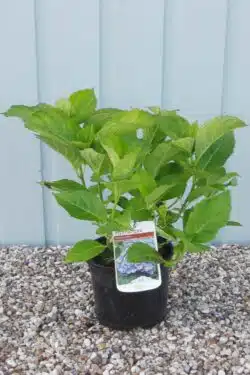 This dramatic and impressive looking large shrub is deciduous but this does not detract from the impact this plant can make in a garden during the summer when planted in full sun and a sheltered spot. To keep the bold and impressive Blue colour of this Mophead variety aluminium must be present in the soil if adding aluminium do apply with caution to avoid burning or damaging the root systems. To lower the ph level allowing the aluminium to do its work adding grass clippings, coffee grounds or vegetable and fruit peelings to the area around the plant is the favoured organic, method. Hydrangea hedges can also be grown in large planters or pots making controlling the colour a little easier. This impressive shrub can grow to 150cm.